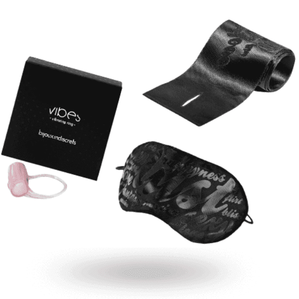 - Conteúdo: Anel vibratório; Algemas de cetim; Máscara de cetim.